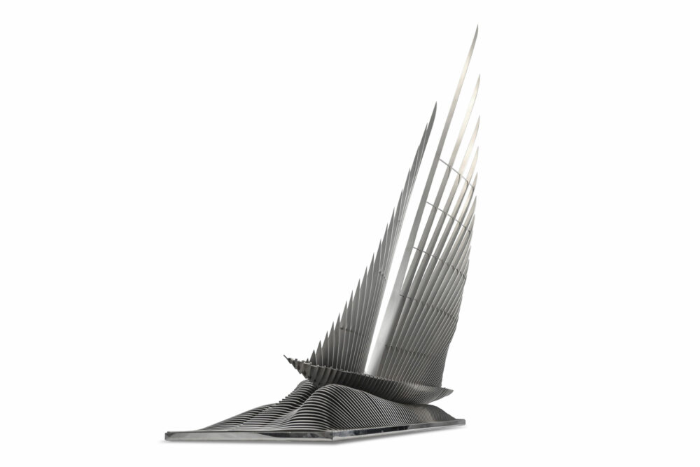 Avec cette nouvelle œuvre, j’explore pour la première fois l’univers de la voile en proposant mon interprétation des légendaires bateaux de la J Class. Leur élégance et leur présence sur l’eau m’ont immédiatement inspiré une sculpture où la légèreté rencontre la tension des lignes.