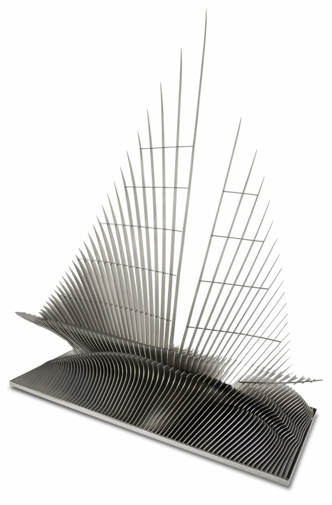 Réalisée en acier inoxydable microbillé, cette pièce s’articule autour d’une succession de lames métalliques qui reprennent l’élan d’une voile gonflée par le vent. Leur déploiement vertical crée une dynamique ascendante, traduisant la puissance et la finesse propres à ces voiliers iconiques.